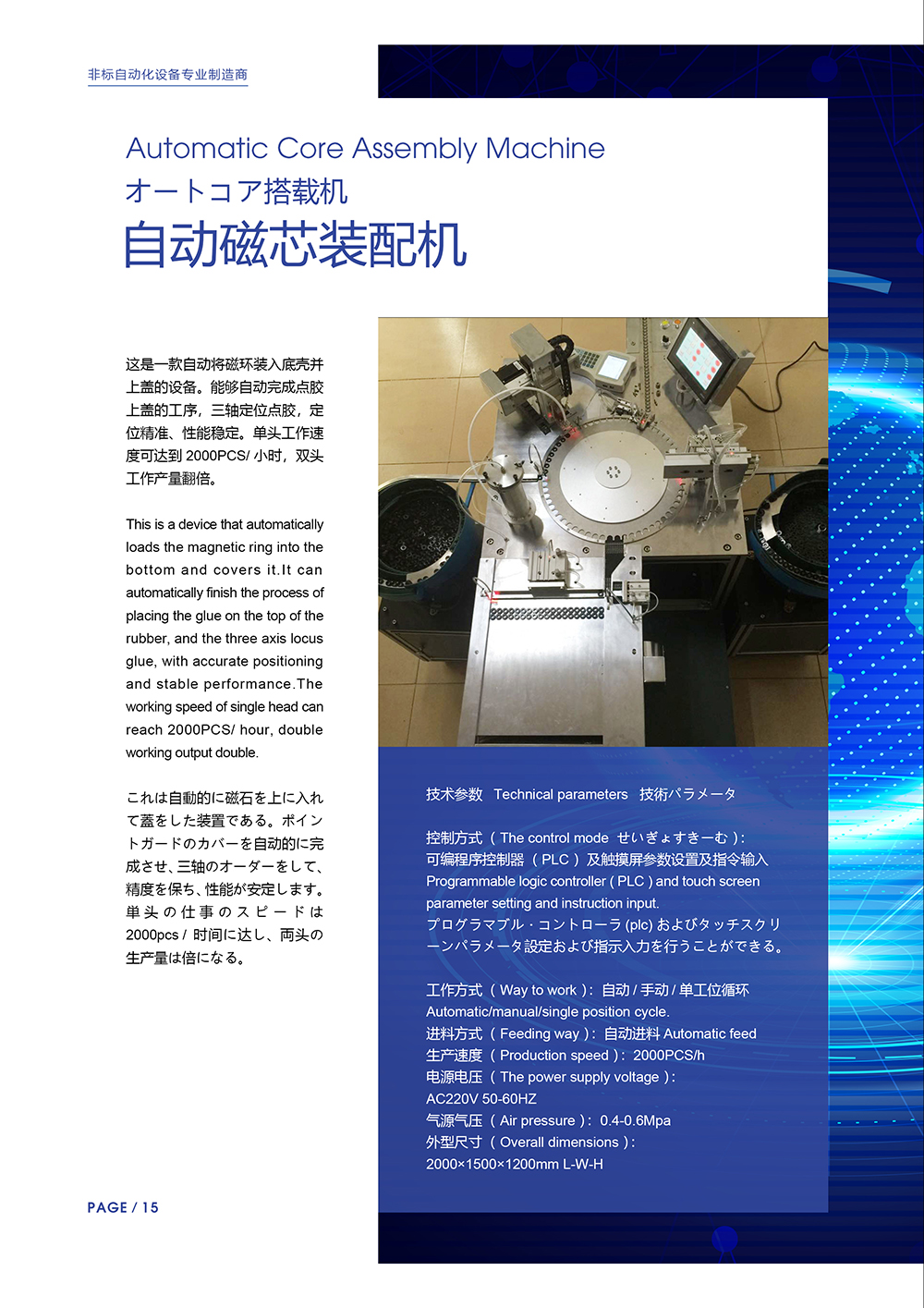 自动磁芯装配机是一款自动将磁环装入底壳并上盖的设备。能够自动完成点胶上盖的工序,三轴定位点胶,定位精准、性能稳定。单头工作速度可达到2000PCS/小时,双头工作产量翻倍。